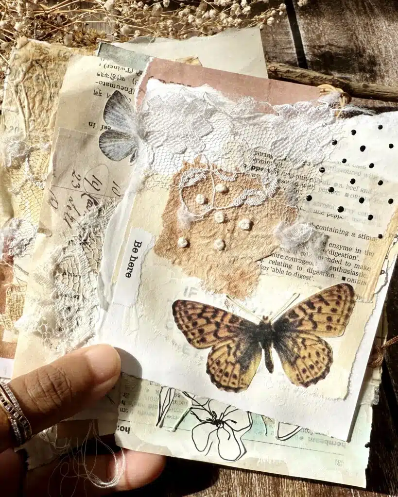 Collage sits at the heart of my practice. I love working with layered papers, fabrics, and expressive mark making to build depth, texture, and story in my art.