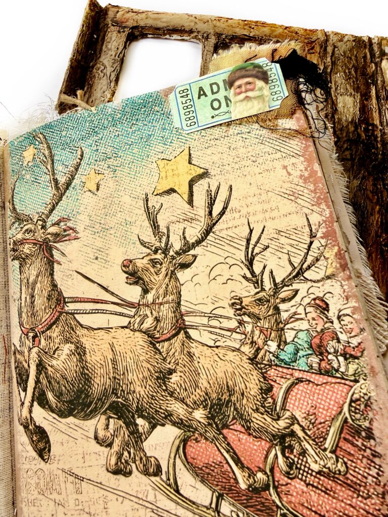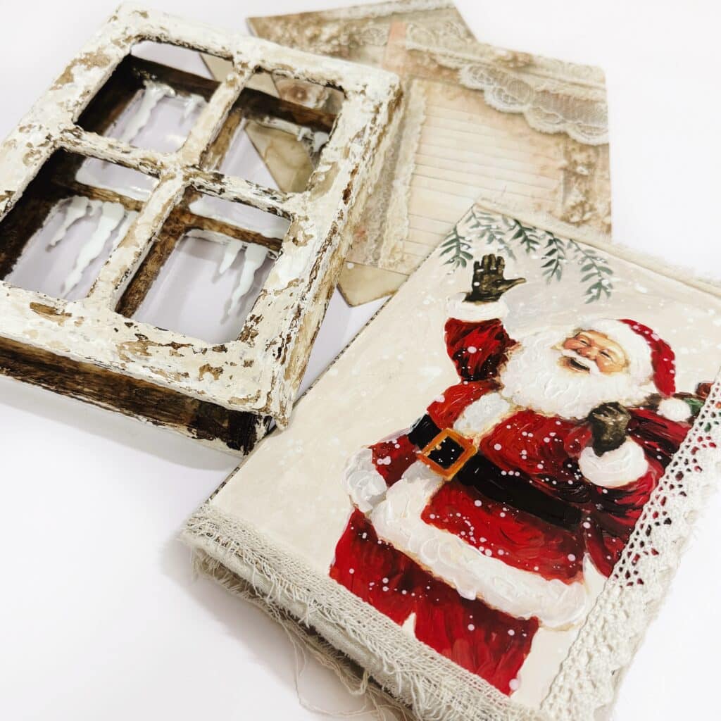 I had no idea how it would turn out when I started. It was just a tiny spark — cut out the box, make a frame, see what happens. But slowly, piece by piece, the idea grew into this rustic window-covered journal with sweet, feisty Santa views and winter scenes glowing behind the frame. And I absolutely love it.