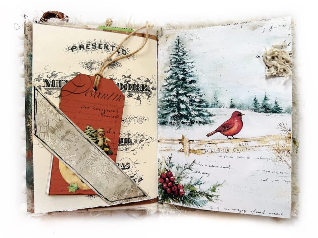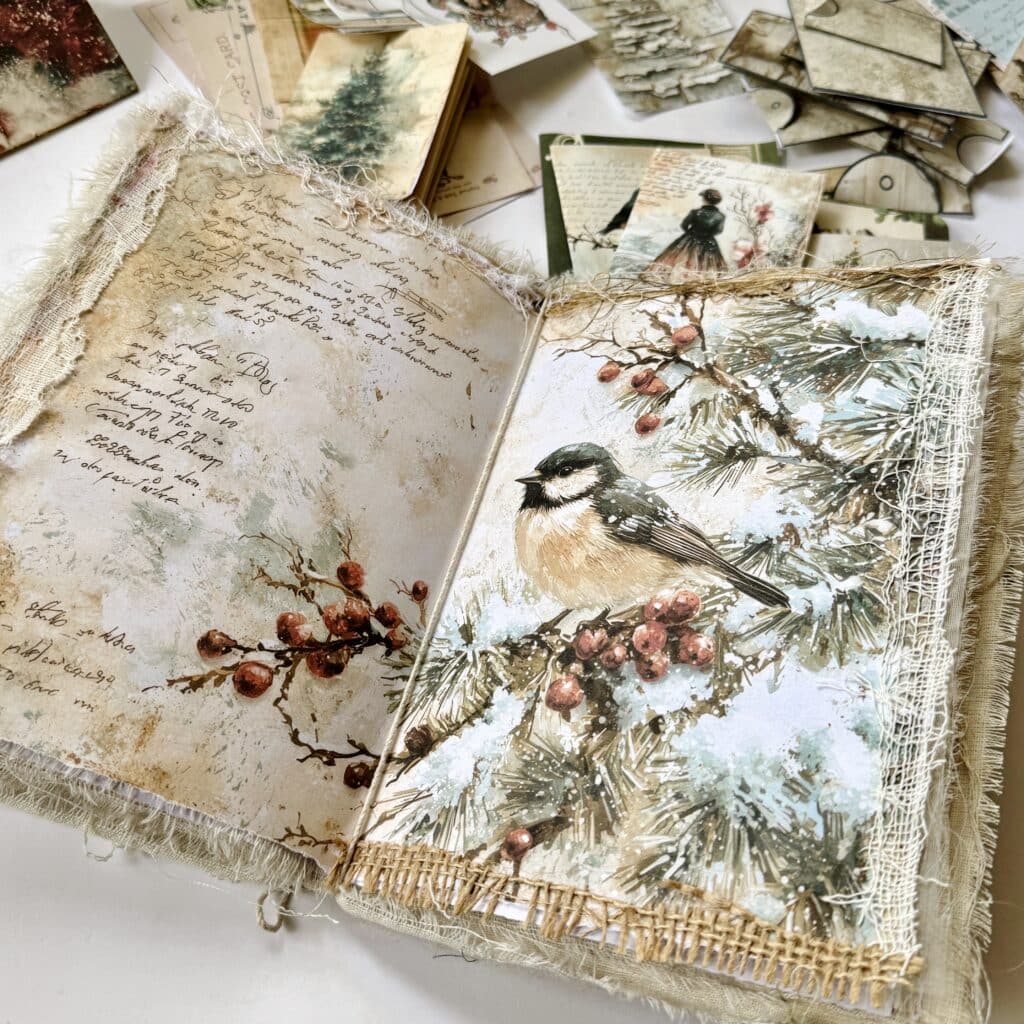 A handmade journal with a rustic, peek-a-boo window on the cover, framing a magical winter scene you created. Inside, pages filled with pockets, tags, and secret spots hold your memories, art, and quiet thoughts.