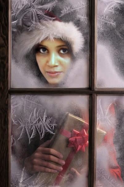 A rustic, textured window cover that frames a Santa-filled or wintery view