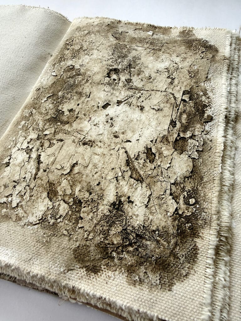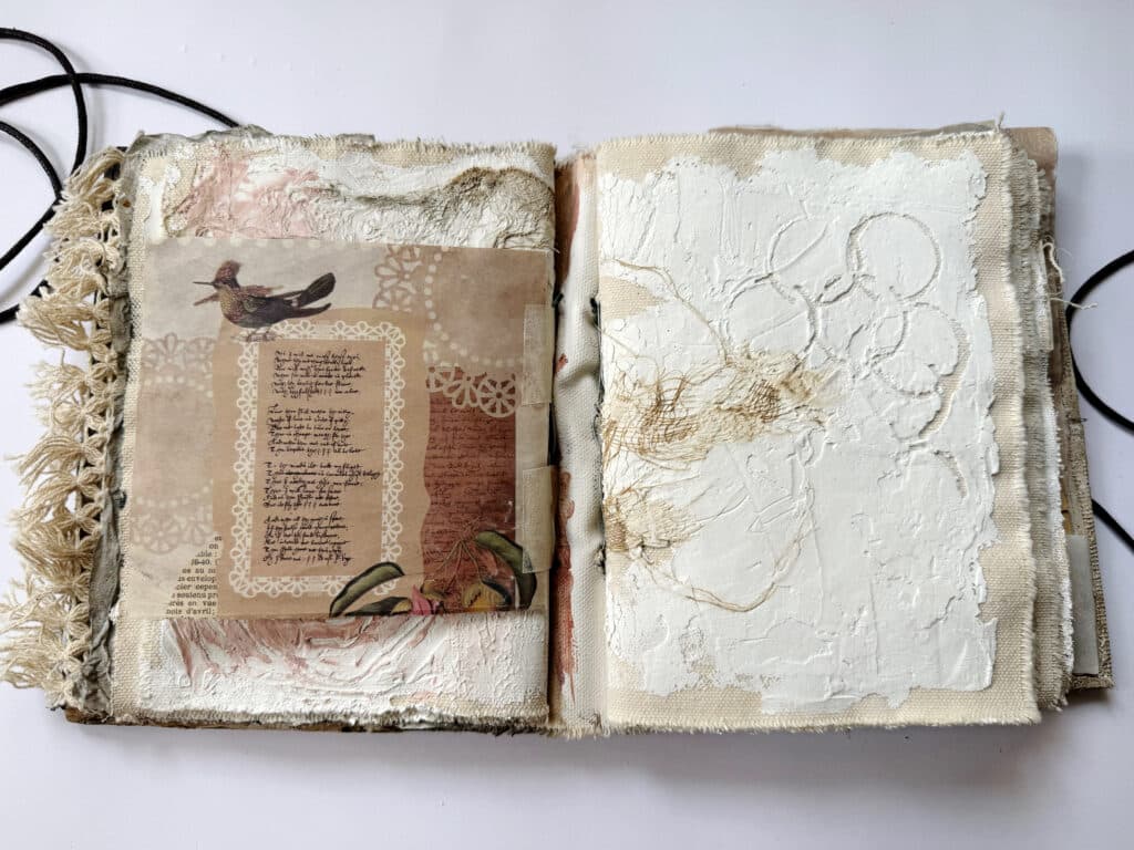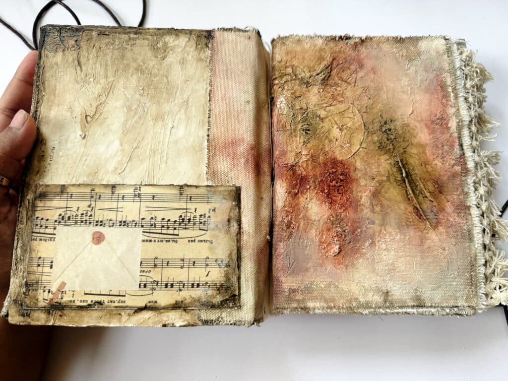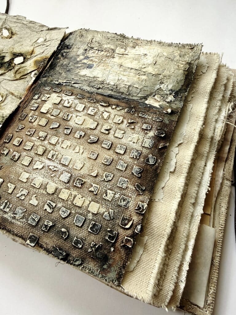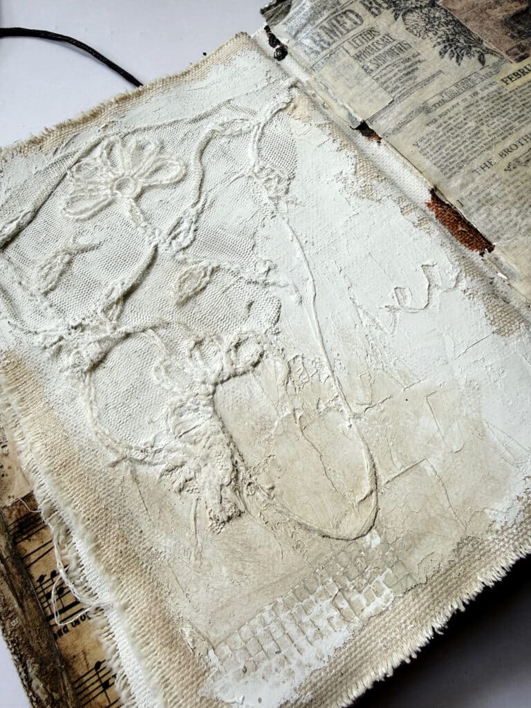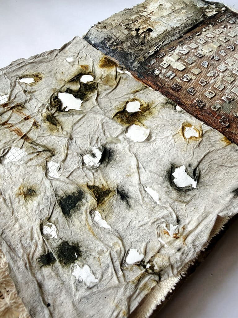 I’m also sharing some photos of the pages below. Each spread has its own personality — from crackled plaster to smooth putty sections to fabric impressions and scraped layers.
