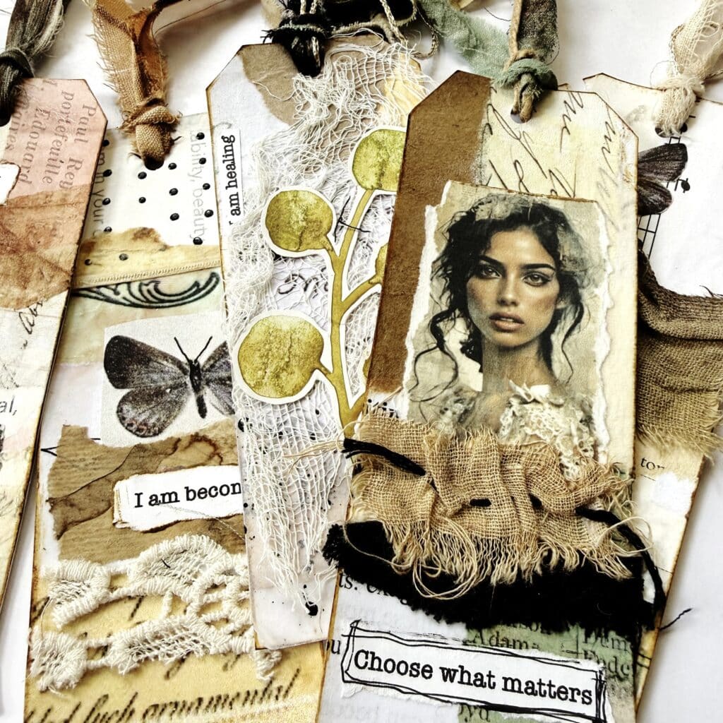 You’ll mostly use what you already have — paper scraps, old book pages, fabric bits, glue, scissors, and a few basic art tools. A detailed supply list is included inside the class.