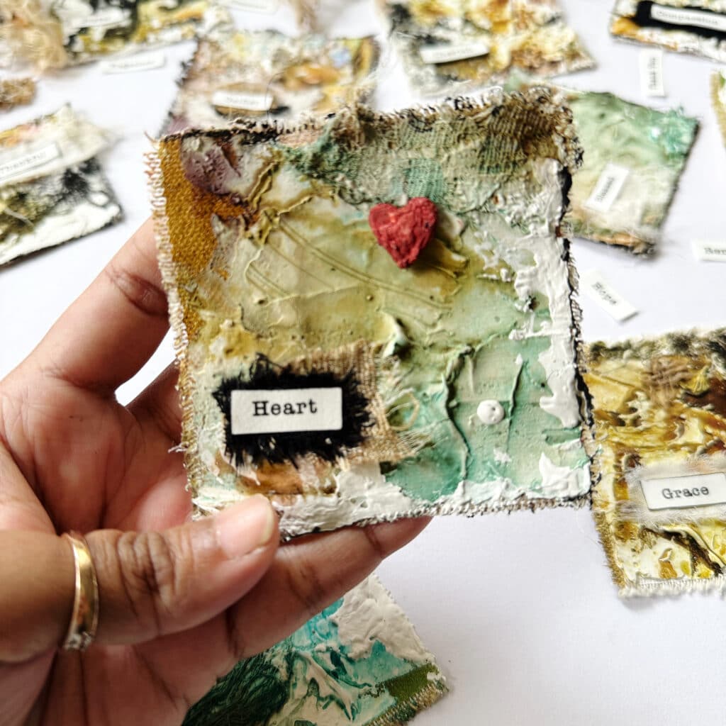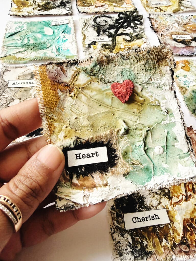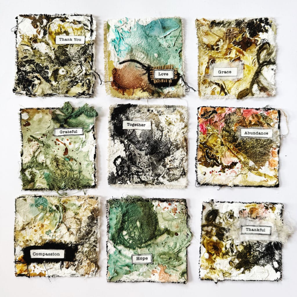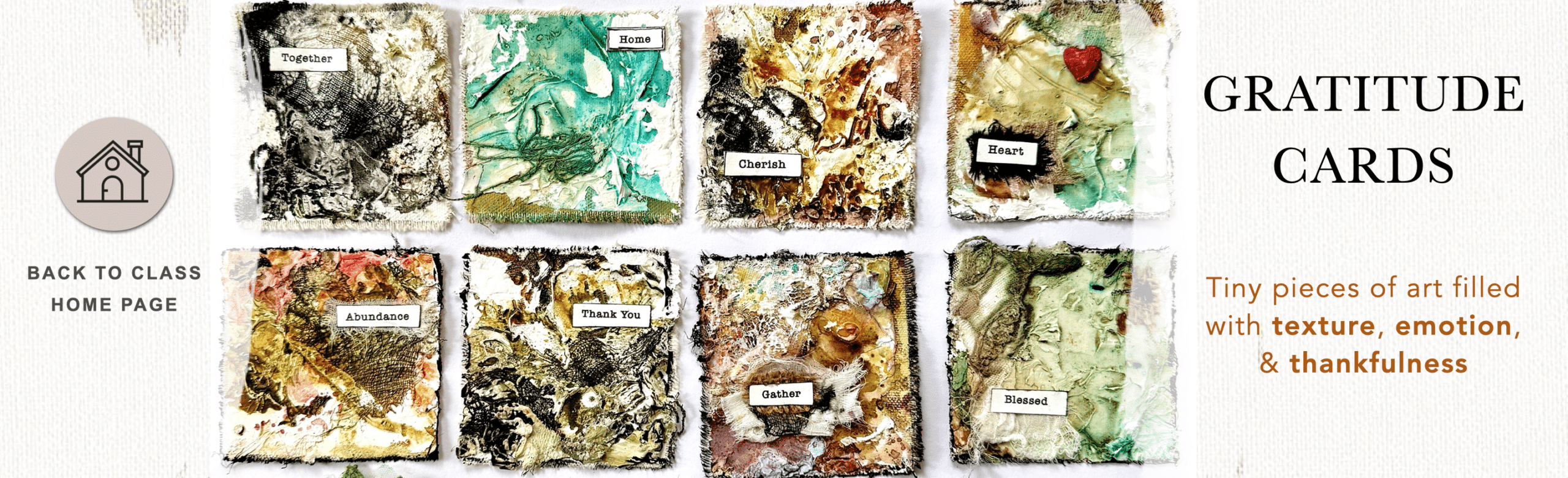 During the Thanksgiving season, we often speak our thanks, but I wanted to create a way to feel gratitude — through our hands, through art, through presence. These tiny Gratitude Cards are more than mixed media pieces; they are tactile reminders of love, connection, and appreciation.