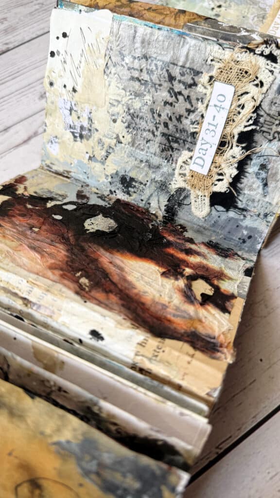 If you’re curious about how this mixed media artist book came together, I’ve filmed the entire process — from the moment the idea sparked to stitching all ten booklets into this unfolding accordion artist book.