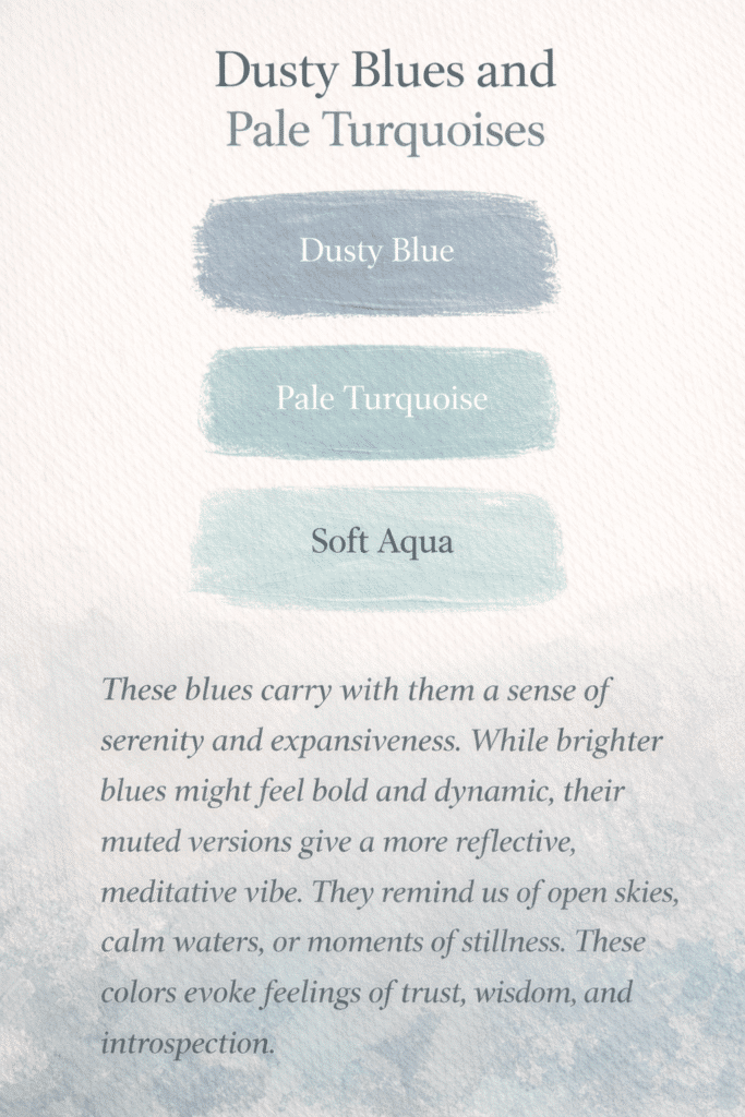These blues carry with them a sense of serenity and expansiveness. While brighter blues might feel bold and dynamic, their muted versions give a more reflective, meditative vibe. They remind us of open skies, calm waters, or moments of stillness. These colors evoke feelings of trust, wisdom, and introspection.