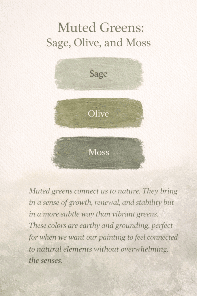 They bring in a sense of growth, renewal, and stability but in a more subtle way than vibrant greens. These colors are earthy and grounding, perfect for when we want our painting to feel connected to natural elements without overwhelming the senses.