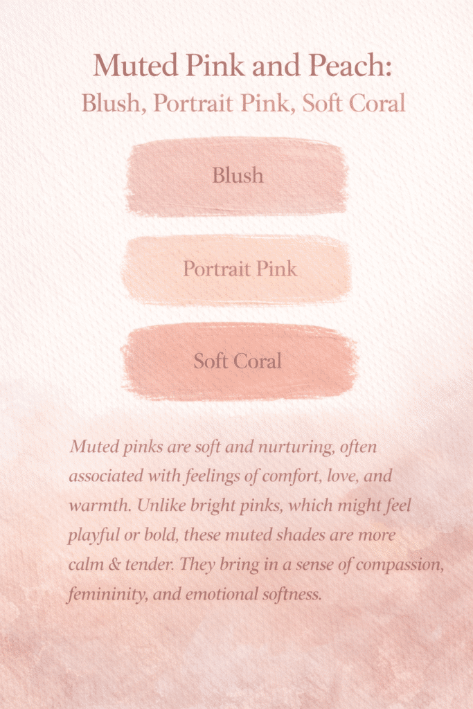 Muted pinks are soft and nurturing, often associated with feelings of comfort, love, and warmth. Unlike bright pinks, which might feel playful or bold, these muted shades are more calm & tender. They bring in a sense of compassion, femininity, and emotional softness.