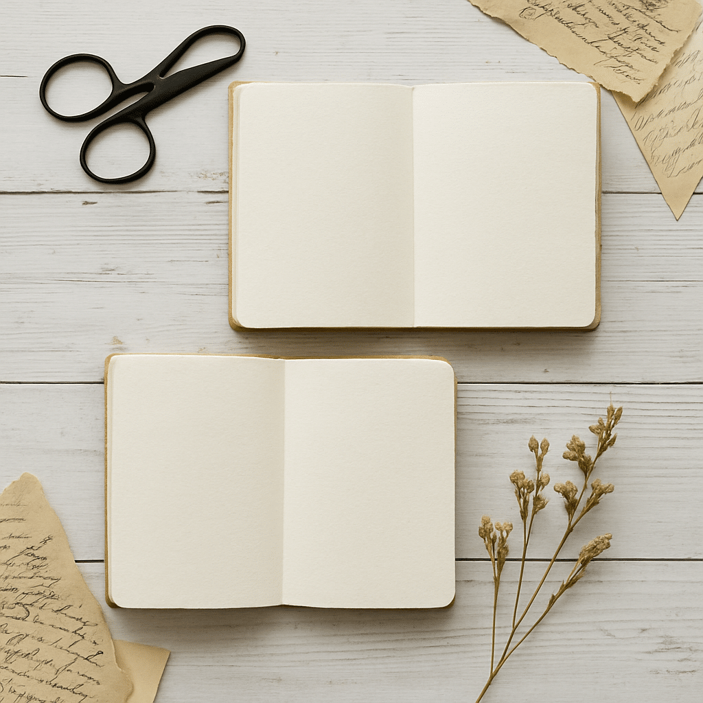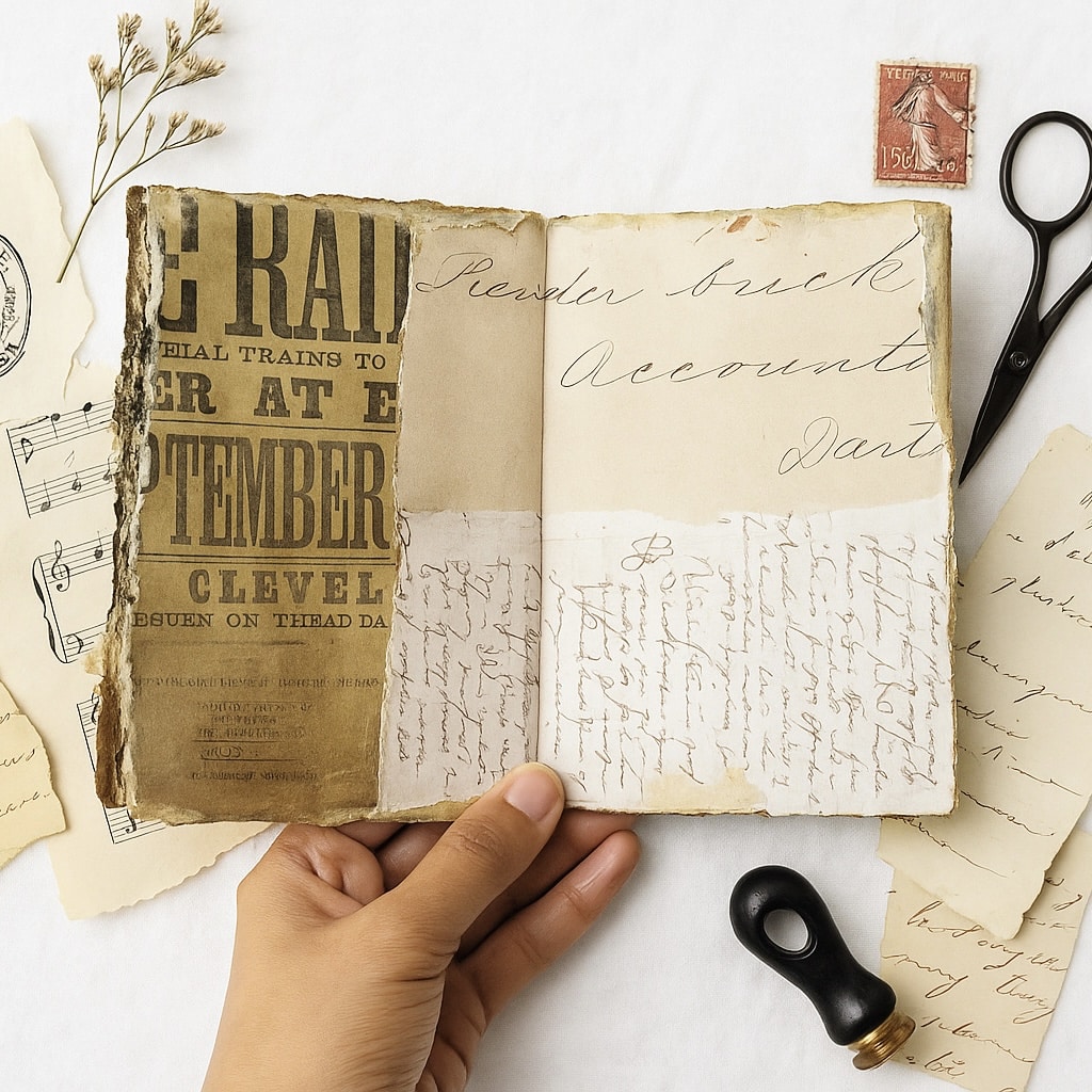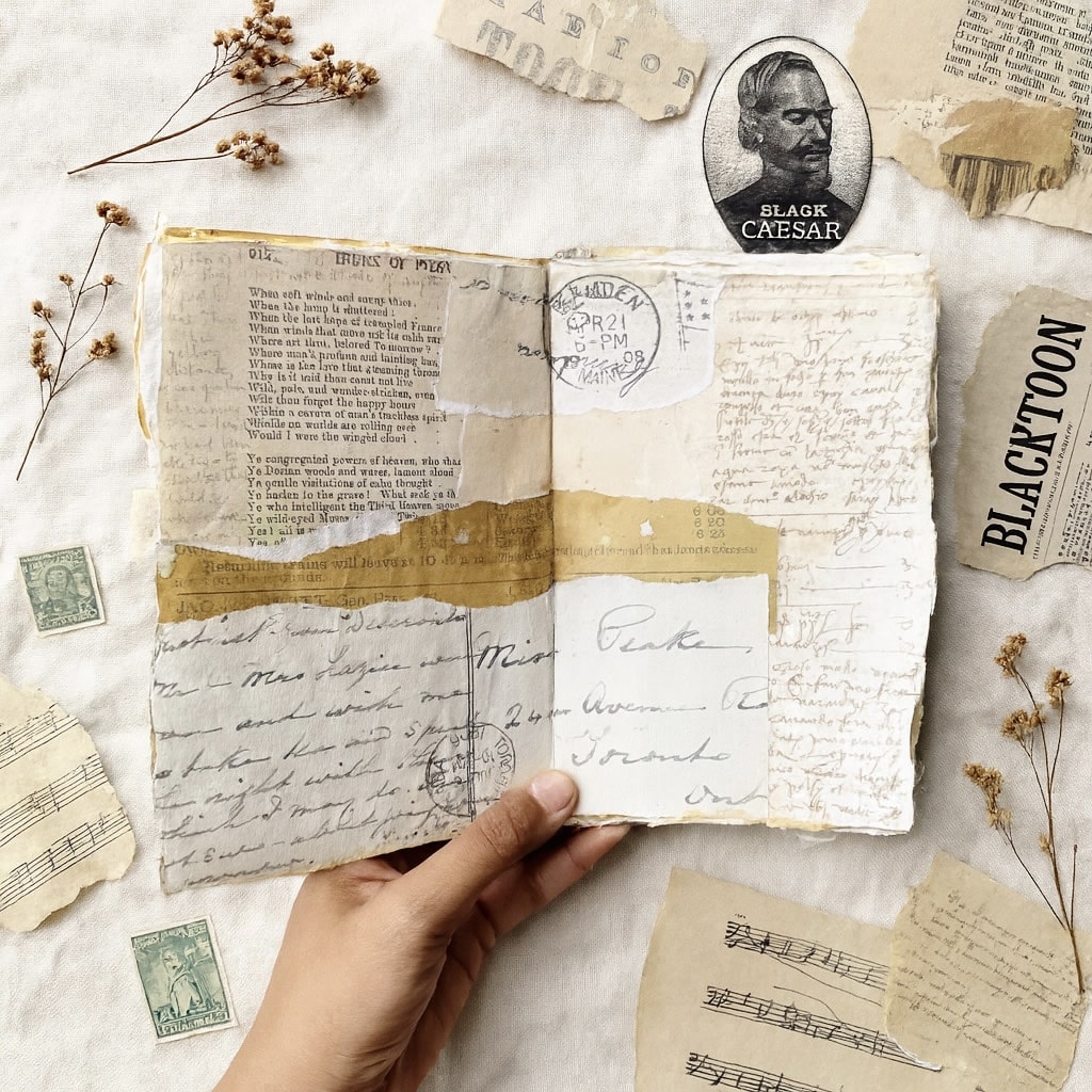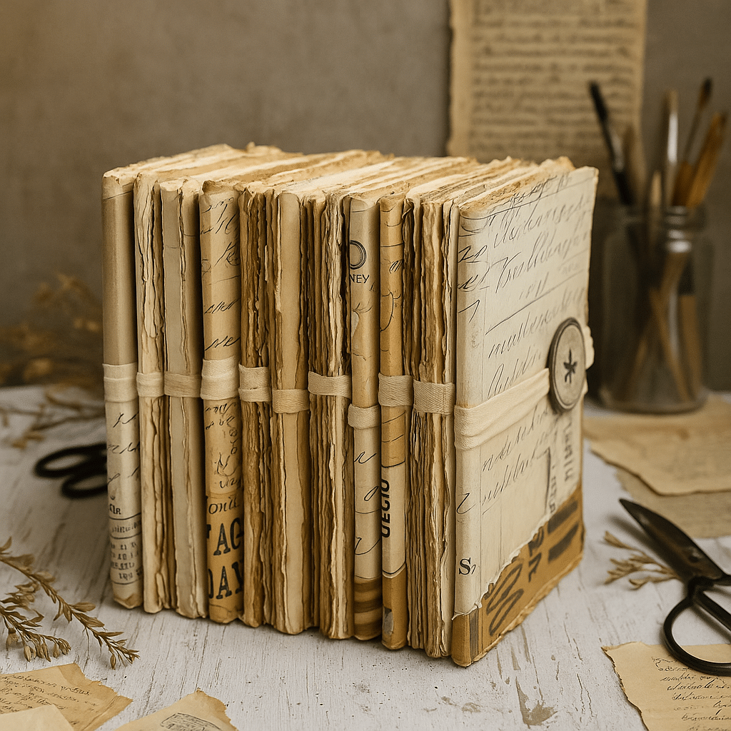 You sit down to create, but instead of facing the dreaded blank white page, you open a handmade journal already rich with whispers of the past — torn edges, handwritten notes, yellowed textures, fragments of stories.