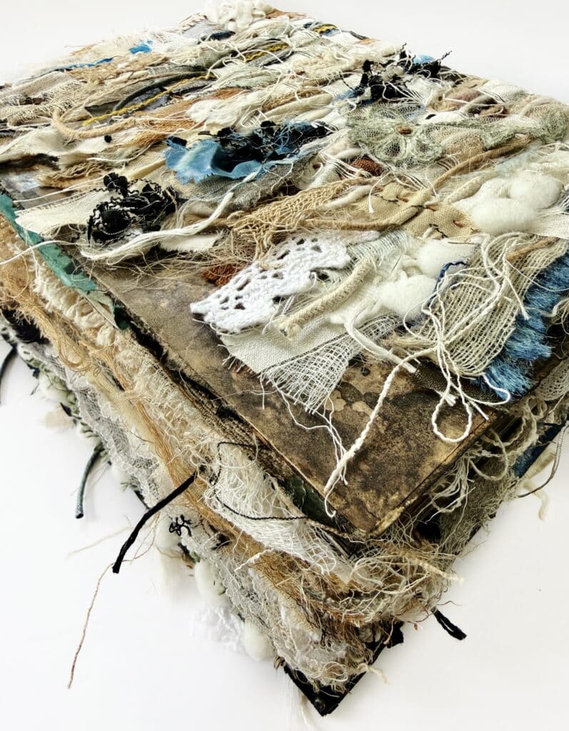 Weave fabrics, laces, truths, and textures into a soulful journal cover.