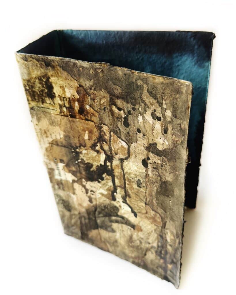 Transform old book pages with intuitive acrylic dyeing for inky, textured layers.